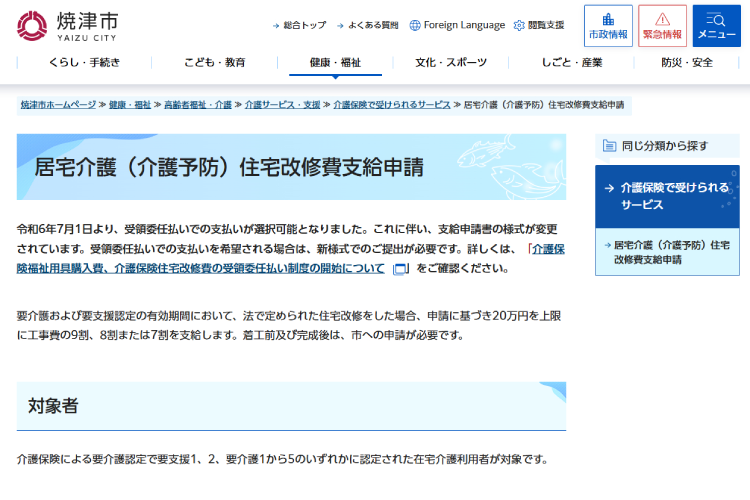 焼津市の介護リフォーム補助金「居宅介護(介護予防)住宅改修費支給制度」