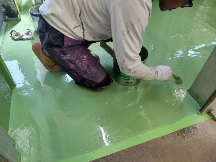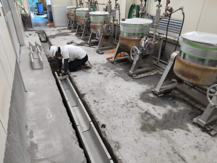 床タイルや排水側溝の経年劣化が著しくて作業に影響が出てきましたので。