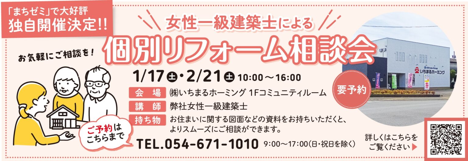2026年1月17日(土曜日)に「焼津まちなかゼミナール」で大好評いただいていた「女性一級建築士による個別リフォーム相談会」が独自開催されます。