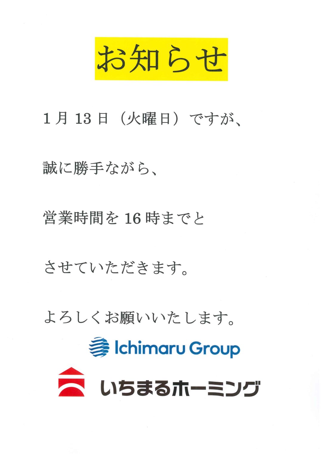 お知らせ・イベント情報 営業時間短縮のお知らせ 2026年1月8日(木) 1月13日(火曜日)は誠に勝手ながら営業時間を16時までとさせていただきます。 ご迷惑をお掛けして申し訳ありません。 ご理解の程よろしくお願いいたします。 前へ一覧へ次へ 最新記事 2026年1月8日(木) 営業時間短縮のお知らせ 2026年1月7日(水) 独自開催決定✨「女性一級建築士による個別リフォーム相談会」予約状況(1/7現在) 2026年1月5日(月) 年末間に合わあなかったあなたへ。レンジフードは遅割でピカピカ✨ 一覧へ カテゴリー別 お知らせ イベント情報 その他 カレンダー 2026年1月 日 月 火 水 木 金 土 « 12月 123 45678910 11121314151617 18192021222324 25262728293031 月別アーカイブ ブログ一覧 お知らせ・イベント情報 リフォーム 店舗・工場・事務所 エネルギー事業 不動産