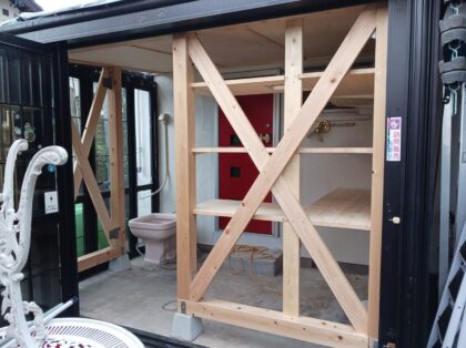 テラスに出入りできるトイレからの出入口と、安全に上り下りできるステップ、キャットタワーを設置しました。