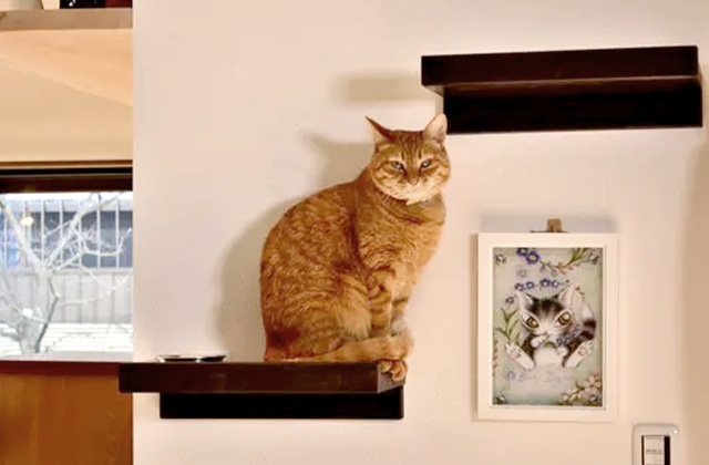 ねこちゃんに必要な運動は、上下運動と言われています。そしてねこちゃんの特性として、高い場所を好み、家族を見下ろすことで安心しますので、キャットステップを付け天井近くにキャットステージを設置します。